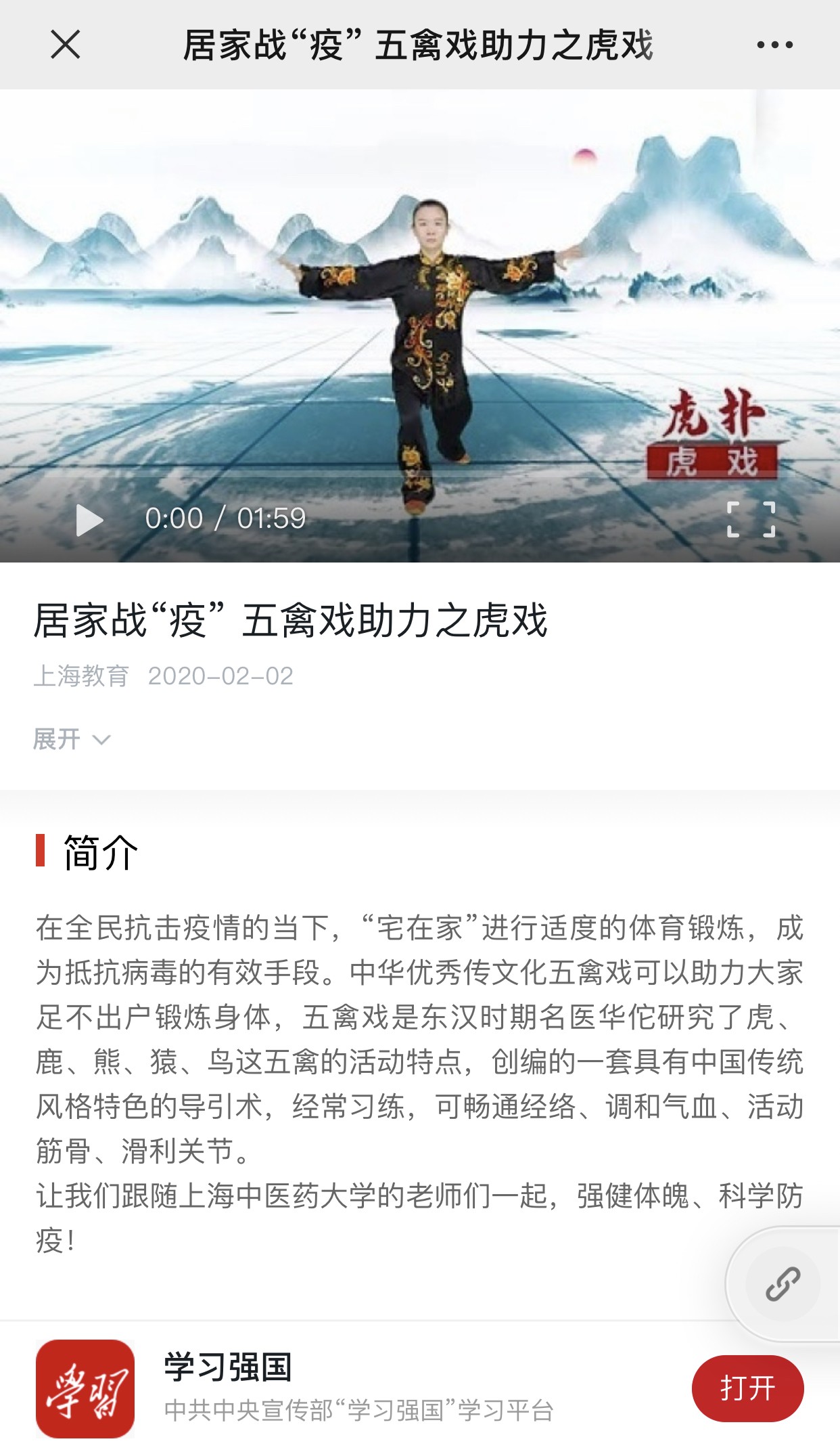 在新冠肺炎疫情防控阻击战中,广大人民群众响应国家号召不外出。长期居家、久坐不动,易致情绪不稳,机体免疫力降低。根据疫情防控工作情况,体育部党支部结合学校的优势和特点,强化宗旨意识和服务意识,1月末先后创编并推出以“居家战‘疫’,以‘武’助力”为主题的五禽戏、八段锦、太极、武术拳操等功法套路,同时通过中华中医药学会、上海市教育委员会、上海市教育委员会艺术教育处、上海市学校体育评估中心、上海武术院等部门的相关平台推广,并被学习强国、校级微信公众号等平台转载。这一系列功法套路,面向社会大众广泛传播,为打赢疫情防控阻击战增添战斗力。