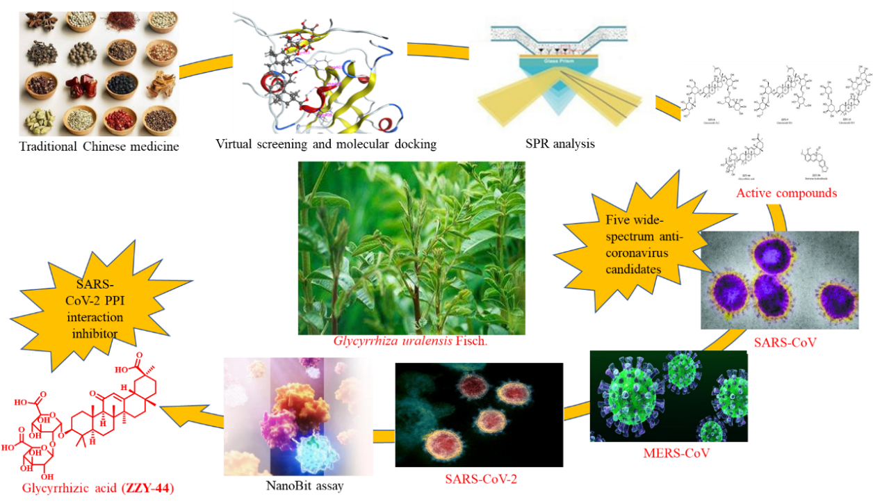中医药在抗击新冠肺炎疫情中发挥了积极作用。通过现代药理学实验手段从有效中成药和方剂中寻找活性成分并进一步揭示其作用机制,具有重要科学和应用价值。林国强教授团队及陈红专教授团队揭示了从中药甘草中分离得到的活性成分甘草酸的抗新冠病毒的作用机制。研究从临床抗新冠病毒有效的中药方剂出发,通过计算机辅助虚拟筛选并运用SPR及NanoBit等生物技术及药理学的研究发现了甘草酸可以显著阻断新冠病毒棘突蛋白和人体内靶蛋白ACE2的结合,是抗新冠病毒活性的有效中药单体。