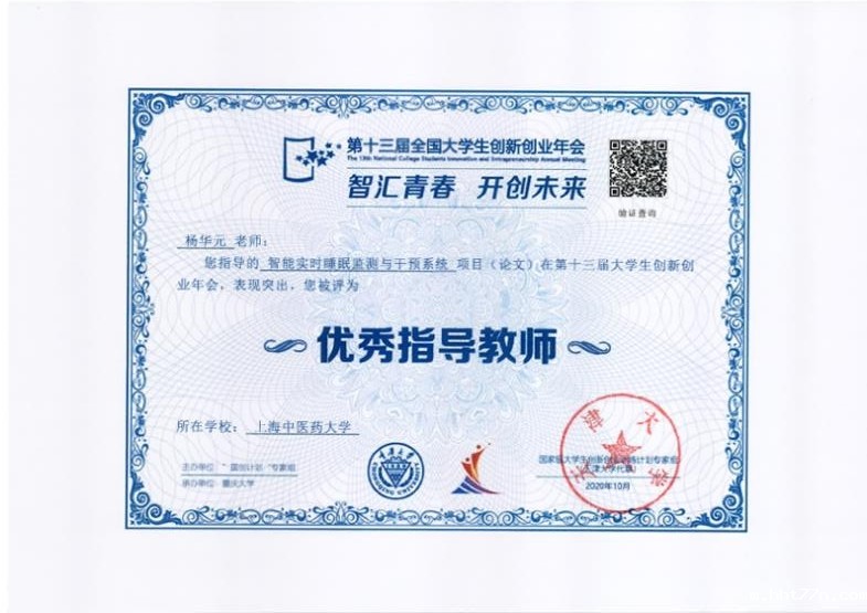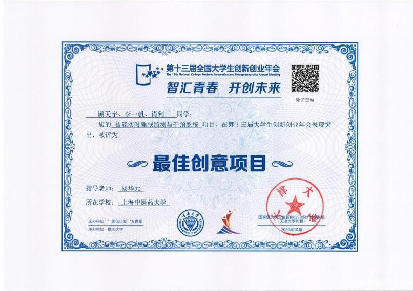 近日,第十三届全国大学生创新创业年会在重庆大学举行。我校教授杨华元指导,学生顾天宇、李一帆、肖利完成的“智能实时睡眠监测与干预系统”项目获评为“最佳创意项目”, 杨华元教授被评为“优秀指导教师”。