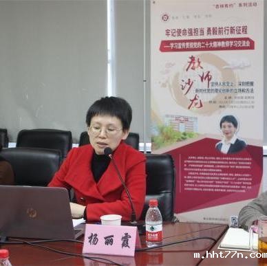 3月23日下午,“牢记使命强担当 勇毅前行新征程——深入学习宣传贯彻党的二十大精神”专题第四期教师学习交流会暨第36期“杏林有约”教师午间沙龙在行政中心312会议室举办。我校“杏马”理论宣讲团成员、马克思主义学院副教授杨丽霞以“坚持人民至上,深刻把握新时代党的理论创新的立场和方法”为题作专题辅导报告。宣传部(党委教师工作部)副部长刘虹主持会议,并向杨丽霞颁发“阳光导师”荣誉证书。青年教师班主任、教师党支部党员代表等40余人参加学习交流。