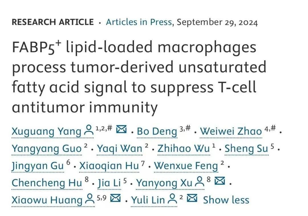 针对以上科学问题,上海中医药大学附属龙华医院杨旭光团队与复旦大学上海医学院、复旦大学附属中山医院的研究团队展开合作,在消化领域权威杂志Journal of Hepatology发表了题为FABP5+ lipid-loaded macrophages process tumor-derived unsaturated fatty acid signal to suppress T-cell antitumor immunity的最新研究成果。深入探讨了TME中特定巨噬细胞亚群FABP5+脂质负载巨噬细胞的免疫抑制功能,揭示了脂肪酸信号对巨噬细胞功能调控的机制。