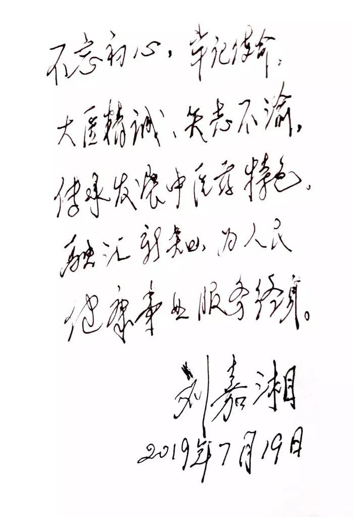 此后,他还为青年中医工作者和学生亲笔题词“不忘初心、牢记使命。大医精诚,矢志不渝。传承发展中医药特色,融汇新知,为人民健康事业服务终身!”