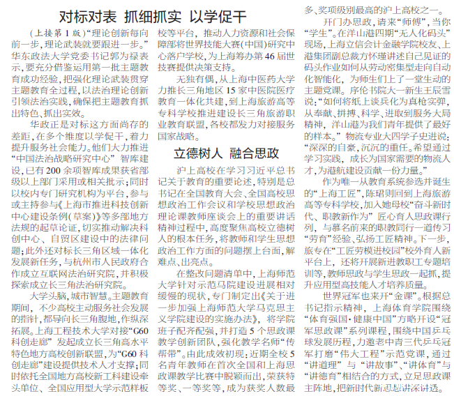 沪上正参加第二批主题教育的众多高校,都像上师大一样在主题教育办“挂图作战”,扎实推进整改落实。从特色学习、以学促干到融合思政,参加第二批主题教育的49所市属高校正对标对表、抓细抓实。