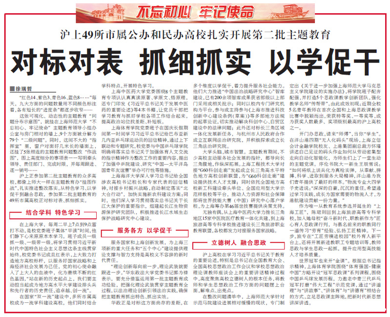 沪上正参加第二批主题教育的众多高校,都像上师大一样在主题教育办“挂图作战”,扎实推进整改落实。从特色学习、以学促干到融合思政,参加第二批主题教育的49所市属高校正对标对表、抓细抓实。