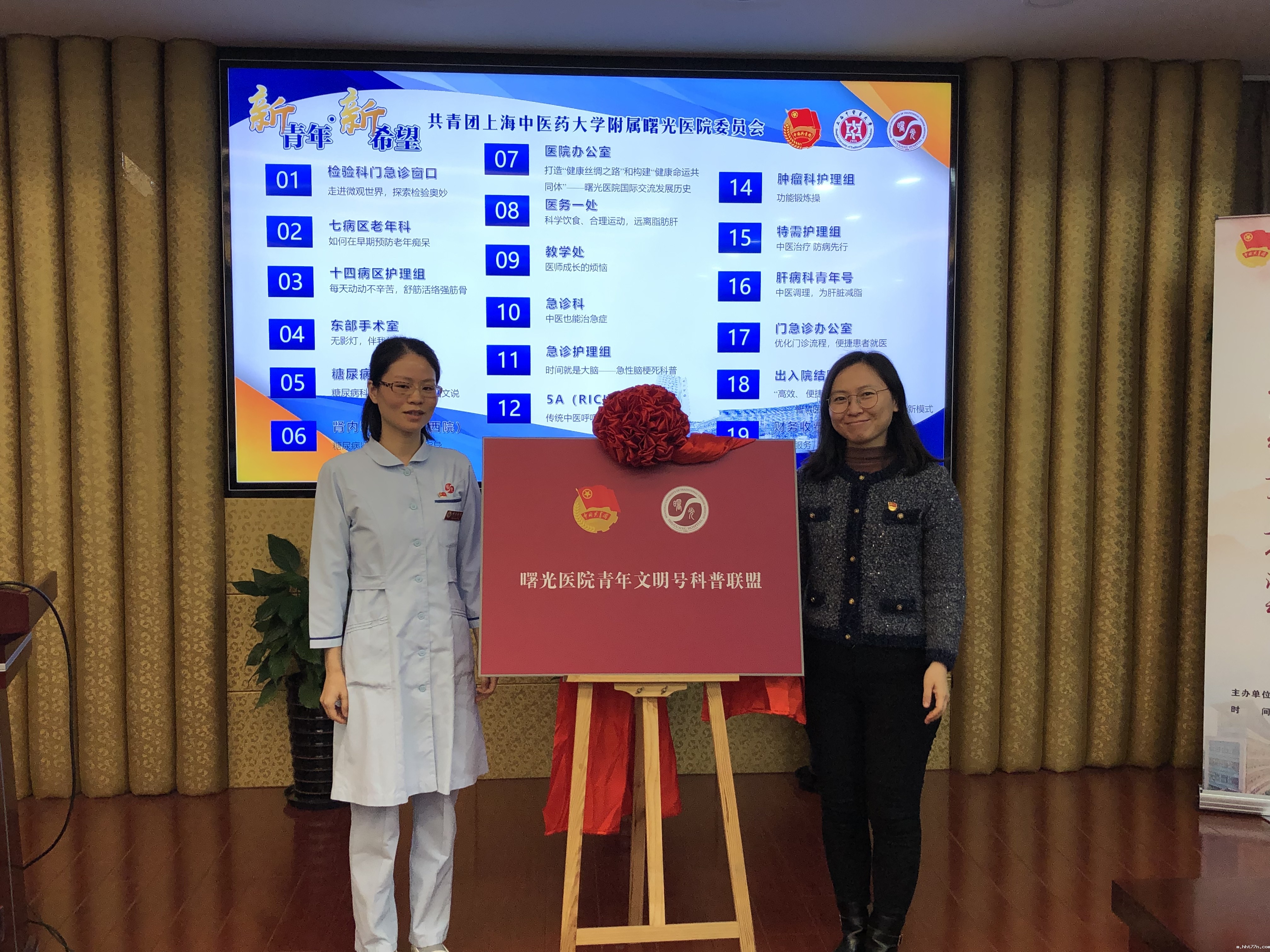 在科普联盟授牌仪式上,曙光医院海派中医科普文化创建纪录片展播,医院团委副书记刘丽艳宣读青年文明号科普联盟倡议,号召青年朋友们身体力行,积极开展科普工作。张莎莎与刘丽艳共同为“青年文明号科普联盟”揭牌。曙光医院青年文明号团队立足实际工作,聚焦各类科普主题,传播健康知识与文化,为健康上海、健康中国建设注入力量。