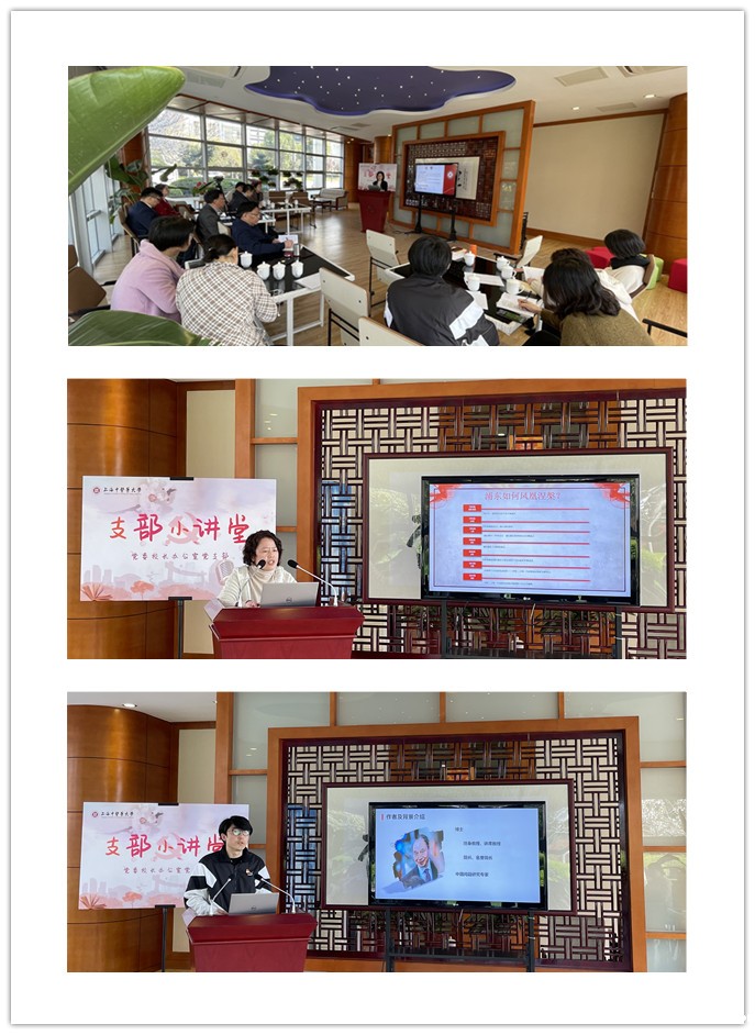 支部成员围绕党史学习教育,首先就习近平同志《论中国共产党历史》开展学习研讨。党委校长办公室主任吴志新领学了“讲好中国共产党的故事”相关内容,并指出大家都是历史中的一员,要践行不忘初心的使命,为党增光添彩;要学会把鲜活的党史素材传递给读者,讲好党的故事;作为上中医人,在讲好党的故事同时也要讲好中医药的故事。党支部书记、党委校长办公室副主任陈正芹,领学了“把红色基因传承好,把红色江山世世代代传下去”相关内容,并指出在学习党史的过程中要把握三个要素,一是学党史要悟服务之心,二是学党史要强党性修养,三是学党史要修担当作为。