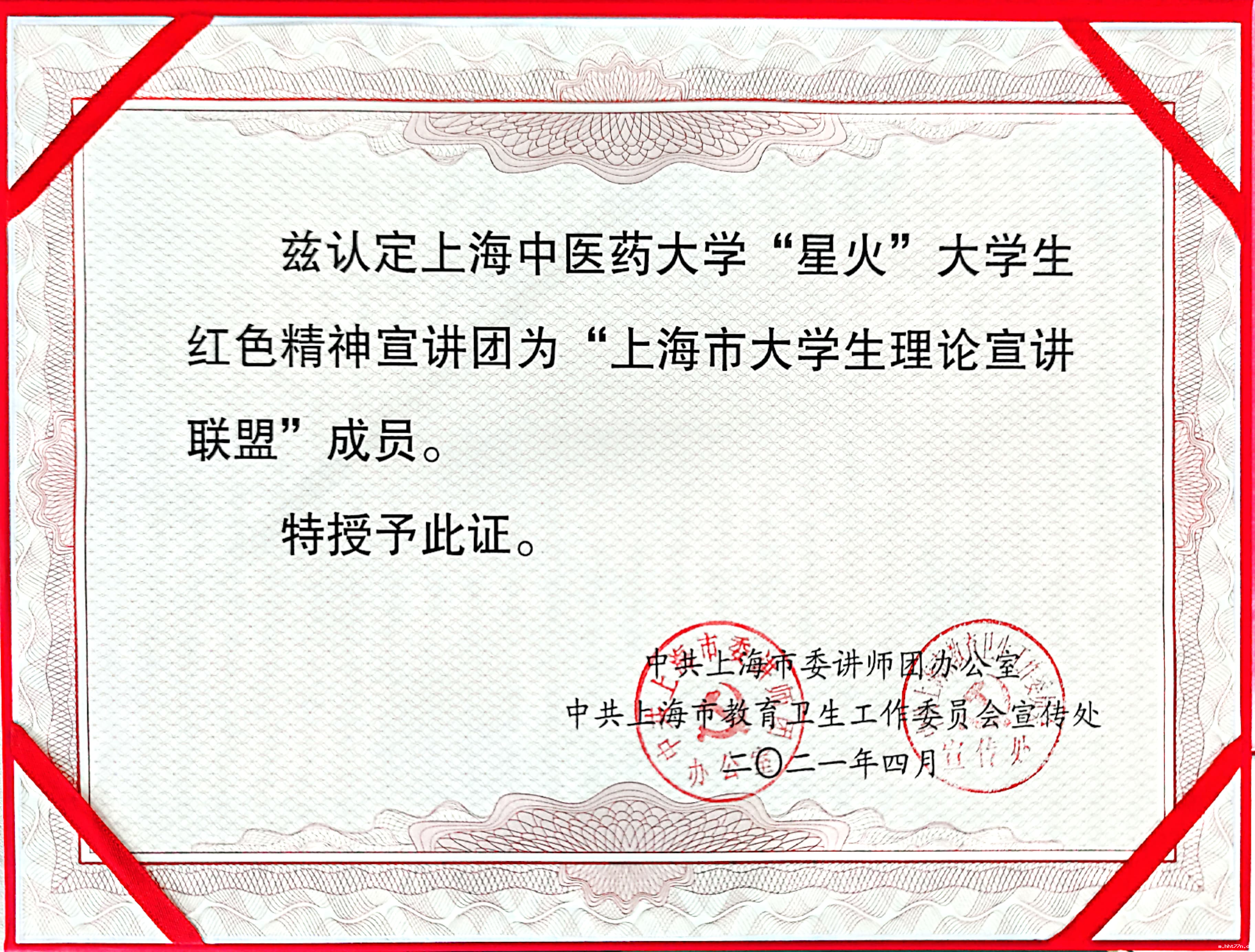 为进一步做好大学生理论宣讲工作,献礼中国共产党中国共产党建党一百周年,由中共上海市委讲师团办公室、中共上海市教育卫生工作委员会宣传处联合打造了“上海市大学生理论宣讲联盟”,我校“星火”大学生红色精神宣讲团脱颖而出入选该联盟。