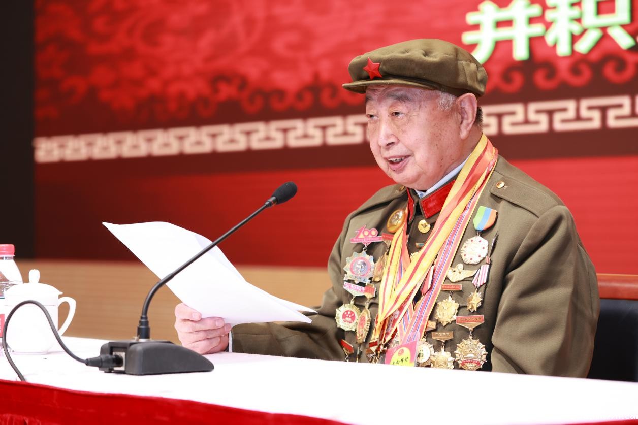 92岁高龄的孙佑民介绍了自己的革命经历。他8岁接受党的教育,当儿童团团长,为抗日队伍站岗放哨,积极宣传党的抗日主张。14岁成长为地方干部,直接从事抗日工作。16岁正式参军,经历了解放战争,参加过淮海战役、渡江战役和解放崇明、舟山群岛的战斗。1952年进入朝鲜东线战场,后按党的指示带领100多名优秀干部战士回国参加人民空军建设。从此开始了长达30多年的飞行战斗生涯,培训带飞新飞行员369名;两次架机飞临天安门,接受毛主席等党和国家领导人的检阅;还创造了空军史上单日飞行强度最高、单次飞行排险次数最多、安全飞行年限最长三项世界纪录。他希望师生们听党话、跟党走,立大志、明大德、成大才、担大任,成为中医药事业的优秀接班人。