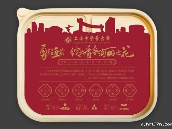6月25日毕业典礼当天,学生食堂为毕业生们精心准备“2021年毕业季花开套餐”,每一份餐食都融入了后勤服务人员对毕业学子的满满深情。红色盒贴上写着“勇往直前,绽放青春绚丽花”,这13个字的主题引自于习近平总书记于今年4月29日在清华大学考察时对青年的寄语——“广大青年要肩负历史使命,坚定前进信心,立大志、明大德、成大才、担大任,让青春在不懈奋斗中绽放绚丽之花!”