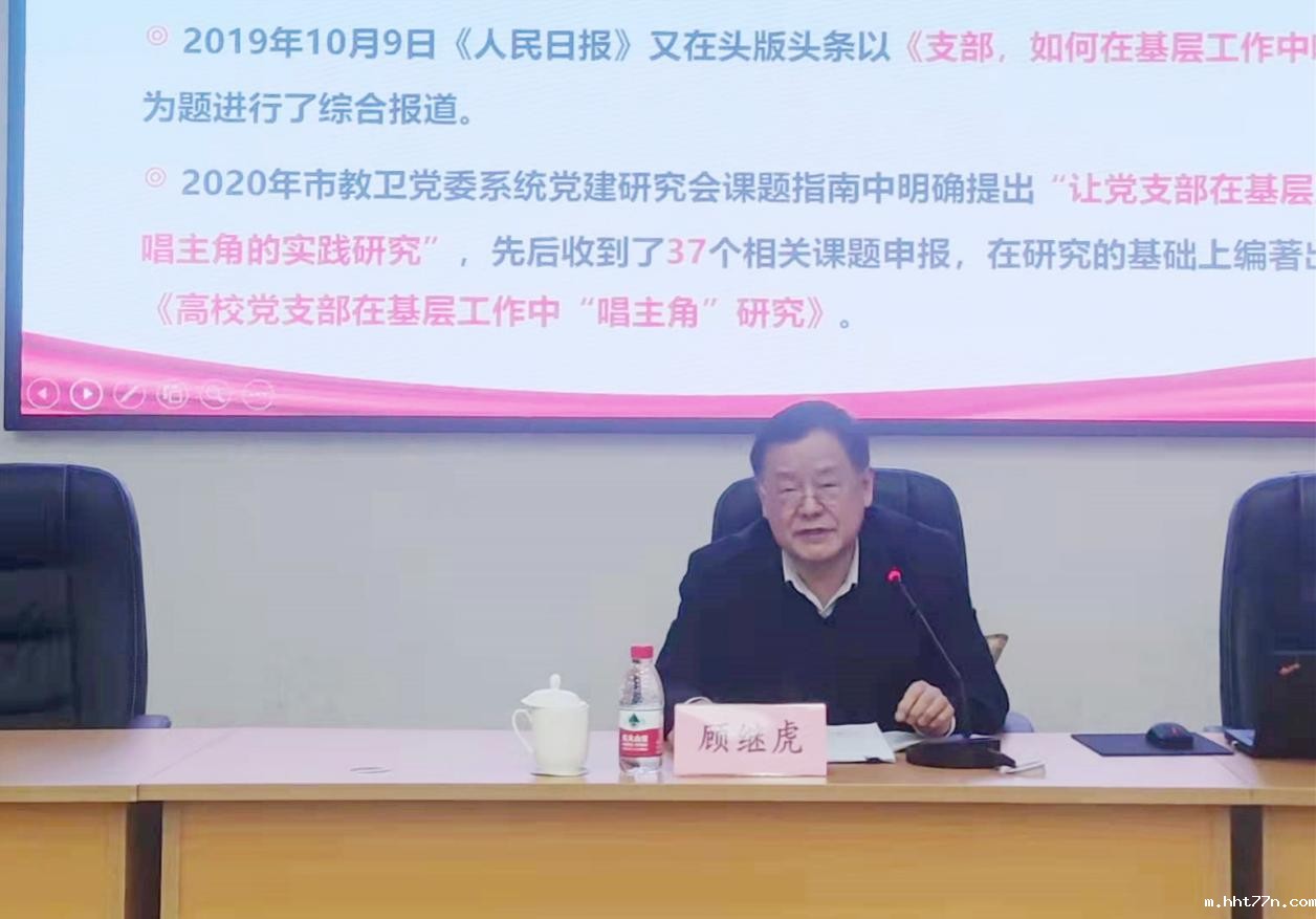 12月10日上午,上海市教卫工作党委党建研究会顾问顾继虎带来《让党支部在基层工作中“唱主角”的思考》讲座。顾继虎强调,要树立“主角”意识,坚持党建工作与中心工作深度融合,在基层工作中敢于、善于“唱主角”。